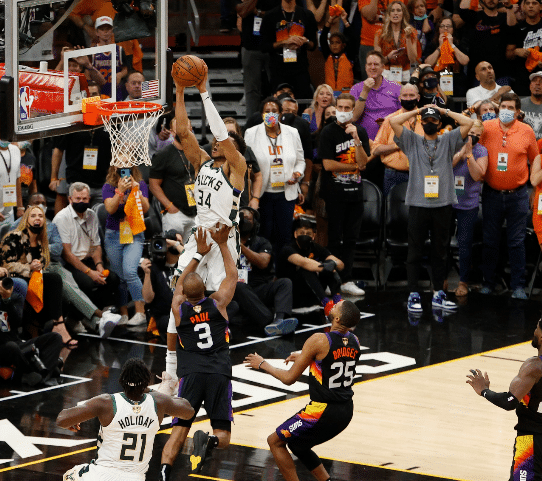 今天的比赛开始之后,太阳队全军发力,单节打出37-21的比分,取得16分的领先优势,不过雄鹿队并没有让太阳的领先优势持续太久,第二节雄鹿队在字母哥霍勒迪等人的带领下全面反扑,单节打出43分的高得分,而太阳队这边则是偃旗息鼓,单节只得24分,上半场比赛结束,雄鹿队反超2分,第三节比赛开始,雄鹿队继续扩大领先优势,太阳队完全压不住雄鹿队的势头,雄鹿队单节再赢7分,最终带着9分的领先优势进入第四节,最后一节比赛,退无可退的太阳队大局反扑,双方在比赛最后关头僵持不下,比赛最后时刻,霍勒迪送出关键抢断,字母哥拿到关键前场篮板,最终雄鹿队胜出,率先拿到总决赛的赛点。