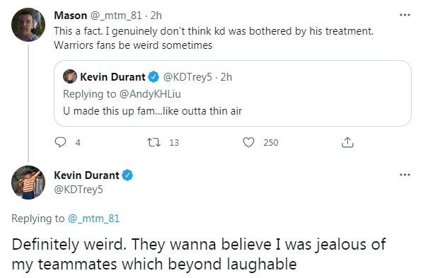 球迷称杜兰特很在意勇士球迷喜欢他还是库里,杜兰特反驳“我反正是不在乎球迷们更爱谁,这对我来说从来都不重要,勇士球迷,他们宁愿去相信我会去嫉妒我的队友,这太可笑了。”