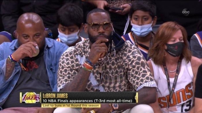 有趣的是,赛后终于看到“衣食父母”老詹出现在现场观战的评论员Skip Bayless在推特上发推说道:“看到了吗太阳队,这就是勒布朗总决赛来到主场给你加油的下场。”老詹赛前就表示自己是来给保罗加油的,但没想到没给好兄弟带来好运,还成为了字母哥隔扣保罗的背景板之一!