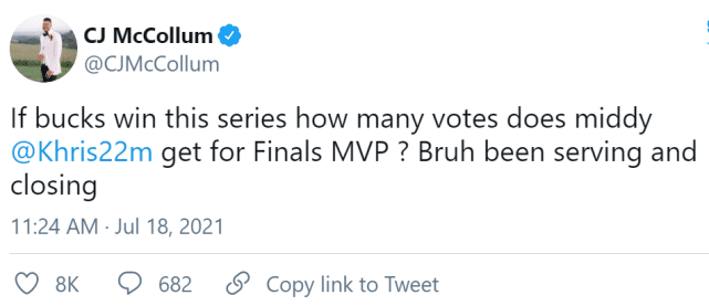 米德尔顿屡屡命中关键球,总决赛至今,他在关键时刻(比赛最后5分钟分差5分内的时段)一共得到14分,而双方其他球员的总和是13分。开拓者球星麦科勒姆在社媒上写道:“如果雄鹿赢下总冠军,米德尔顿能得到多少FMVP的票数?他在终结方面表现很棒。”