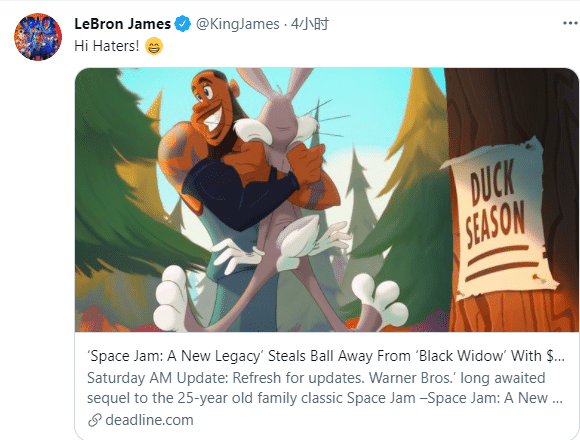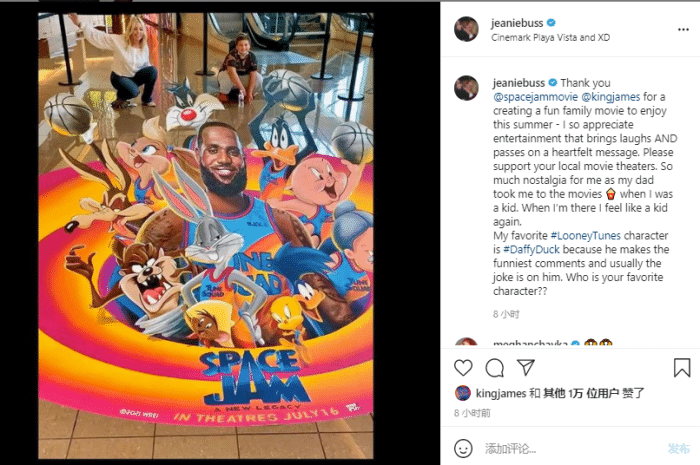 此前湖人美女老板珍妮-巴斯晒出带着家人观看《空中大灌篮:新传奇》的合影,发文感谢詹姆斯制作这样一部有趣的家庭电影,并且呼吁大家去当地的电影院观看电影;詹姆斯第一时间点赞,并且转发珍妮-巴斯的动态,同样表达感谢之情。