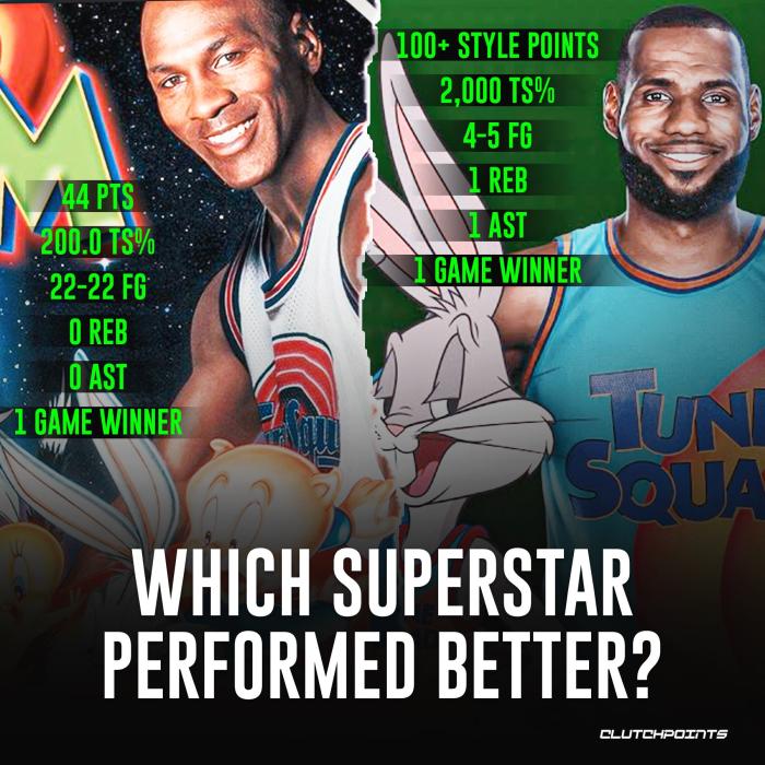 在《空中大灌篮》中,乔丹22投22中,0篮板0助攻,最终拿到胜利;在《空中大灌篮:新传奇》中,詹姆斯5投4中、1篮板1助攻,最终也拿到胜利。