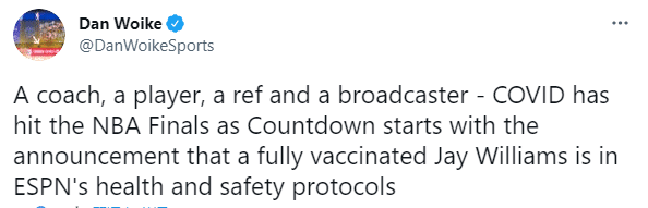 G5裁判肖恩-赖特因健康与安全协议,缺席今日比赛,詹姆斯-威廉姆斯顶替其吹罚本场比赛;ESPN知名评论员杰伊·威廉姆斯(前NBA球员)接种了疫苗仍旧因防疫协议被隔离;一场比赛至少4人隔离,有球员由裁判有教练也有评论员,NBA总决赛陷入疫情危机之中。