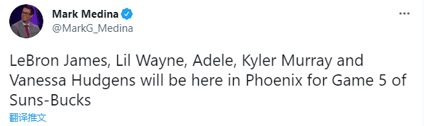 不过总决赛G5场边将迎来很多大腕,其中湖人当家球星勒布朗-詹姆斯将会来到现场观战,因为他和保罗以及太阳总经理詹姆斯-琼斯的关系十分密切;此前詹姆斯所率领的湖人在首轮2-4被太阳淘汰出局,之后詹姆斯一直力挺保罗夺冠,还曾给保罗发短信。