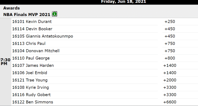 字母哥原本在赔率榜第四的位置上,如今已经升至第二,和布克并列。两人的赔率同为+450。虽然不如杜兰特那么被看好,但也是各自球队里最可能成为FMVP的球星。