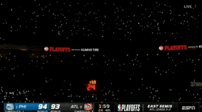 除了特雷杨的失误之外,末节现场的停电也吸引很多人的关注。这场比赛进行到末节还剩下1分59秒的时候,老鹰将分差缩小到只剩下1分,没想到的是老鹰主场出现了停电的情况,费城后场开球,马克西刚拿到球,现场突然断电。球迷们纷纷拿出手机,打开闪光灯,看台瞬间就被这位闪光灯照亮了。很快老鹰主将就将这一问题修好了。