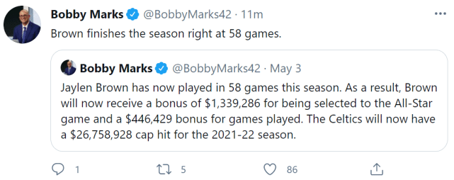 薪金专家鲍比-马克斯表示,布朗已经打了58场比赛,他将因此得到446429美元的奖金,与此同时,入选全明星也将激活另一个奖励条款,获得1339286美元的奖金。