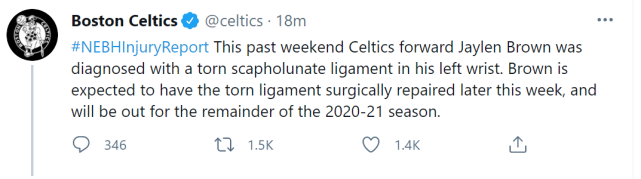 360直播吧讯 北京时间5月11日,凯尔特人官方宣布,前锋杰伦-布朗被诊断出左手腕舟月韧带撕裂,预计将在本周晚些时候接受手术治疗,已经确定缺席2020-21赛季余下的所有比赛。布朗的赛季报销,对凯尔特人而言,无疑是一次沉重的打击!