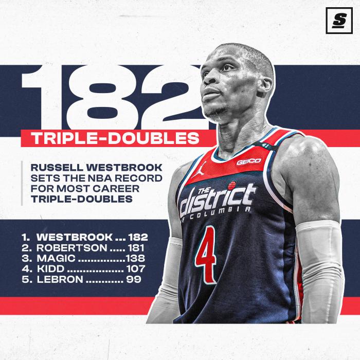 360直播吧讯北京时间5月11日,奇才惜败老鹰,比尔因伤缺阵,韦少单核带队一肩挑,得分、篮板和助攻全靠他,全场28分21助攻13篮板,又狂砍三双破纪录,拿到职业生涯第182次三双,因此韦少正式超越大O罗伯特森(181次)加冕NBA历史三双第一人。