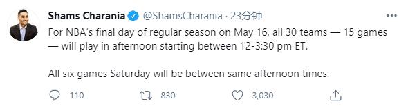 360直播吧讯 北京时间5月10日,名记Shams在个人社媒上爆料了NBA常规赛最后两个比赛日的赛程安排,这个密集程度堪称恐怖。