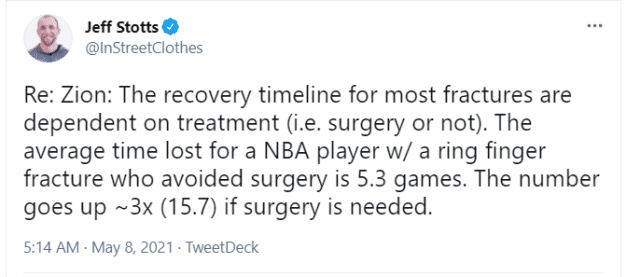 知名运动教练Jeff Stotts谈到了锡安的恢复预估时间。“锡安何时可以复出取决于治疗方式(手术或非手术),依据此前经验,NBA球员因无名指骨折(非手术)的平均缺战场次为5.3场。如果接受手术,那这个数字会上升至大约3倍(15.7场)。”