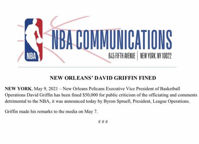 360直播吧讯 北京时间5月10日,NBA官方宣布,因公开批评裁判和发表对NBA不利言论,鹈鹕队的篮球运营副总裁兼总经理大卫-格里芬被罚款50000美元。