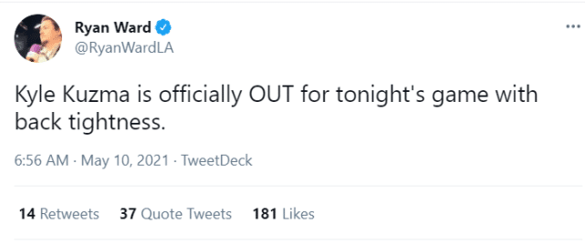 360直播吧讯 北京时间5月10日,湖人官方宣布,库兹马因腰部肌肉紧张缺席今日对太阳的比赛。一天前,库兹马的状态就列为doubtful(大概率不打),而今天赛前,库兹马的状态正式更改为OUT(缺阵)。詹姆斯、施罗德仍未复出,湖人缺兵少将的问题变得更加严重。