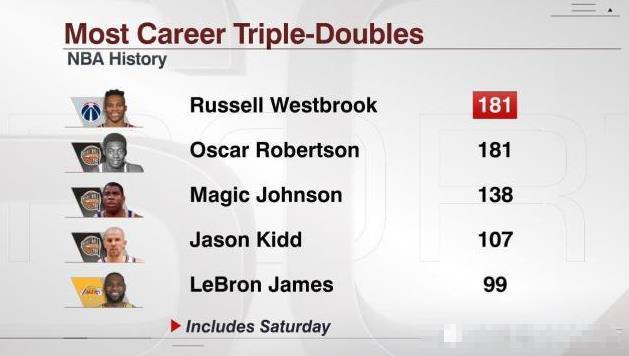 360直播吧讯 对于威少来说,这是他球员生涯最重要的一天。就比赛而言,步行者对着奇才,两支季后赛大门外的球队互啄,可是这场比赛如果奇才赢了,他们还是有机会冲击季后赛。就威少而言,如果本场比赛,他能够再次拿到三双,他将比肩传奇名宿“大O”,成为NBA历史三双次数第一的存在。