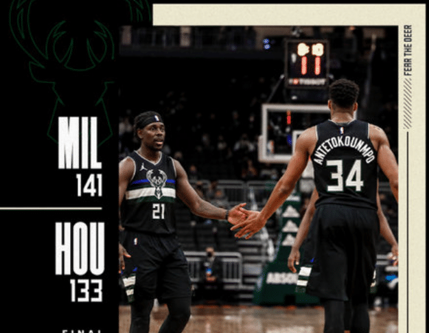 东部篮网遭遇4连败,这给了雄鹿追赶的机会,面对火箭,雄鹿在第三节拉开分差,单节赢了14分,全队7人得分上双,字母哥拿到17分11个篮板和7次助攻,洛佩斯、米德尔顿和霍勒迪的得分都超20分,雄鹿141比133拿下比赛,5连胜反超篮网,升至东部第2的位置。