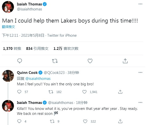 针对湖人的控卫之殇,小托马斯和库克这两位湖人旧将毛遂自荐,其中小托马斯表示:“老兄,我能在这段时间帮助湖人!”库克回复:“我的感觉和你一样!老哥,你不是唯一有这个想法的人!”小托马斯回复称:“杀手!你了解这比赛,一年又一年地证明着这一点,做好准备吧,我们很快就会回来的。”