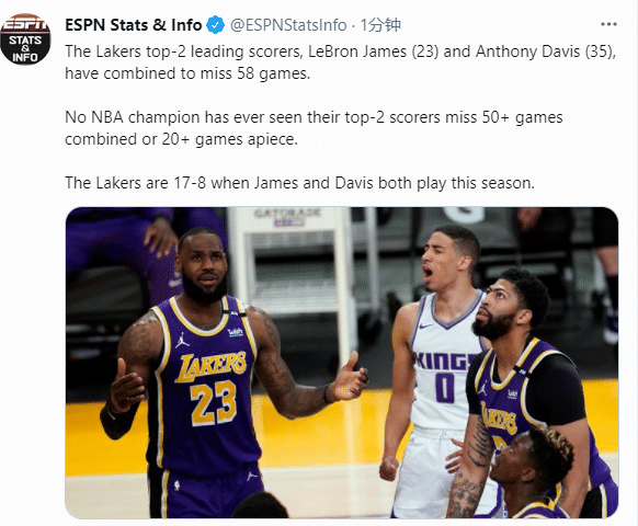 360直播吧讯 北京时间5月8日,ESPN晒出一组数据扎心湖人。赛季至今,球队前二得分手詹姆斯和安东尼-戴维斯总计缺席了58场比赛。放眼全联盟历史,没有任何一个球队能在前二得分手缺席50场以上比赛,或者各自缺阵20场以上比赛的情况下,最终完成夺冠神迹。从这个角度来看,本赛季湖人想要卫冕难度不小。