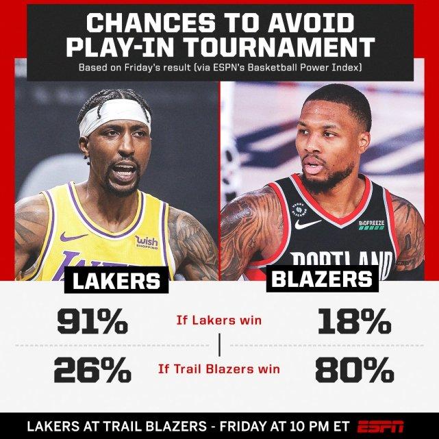 根据ESPN的BPI指数,如果湖人赢下这场比赛,他们有91%的概率能避开附加赛,开拓者只剩18%的概率避开附加赛;如果开拓者赢下这场比赛,他们有80%的概率避开附加赛,湖人只剩26%的概率避开附加赛。