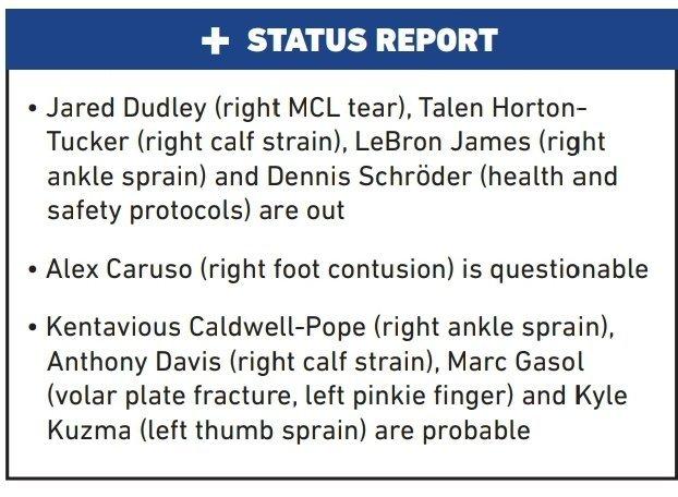 虽然浓眉伤势没有大碍,但湖人的状况依然不容乐观,他们最大的问题在于一号位的人手短缺。能打控卫的詹姆斯、施罗德、霍顿-塔克都不能上场,卡鲁索右脚有伤,出战成疑。就算卡鲁索能打,组织进攻本就不是他的特长。