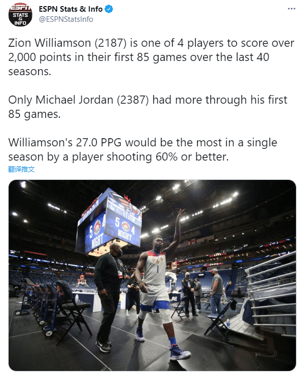 锡安本赛季场均能够轰下27分7.2篮板3.7助攻0.9抢断0.6盖帽,投篮命中率高达61.1%,禁区场均20.3分比肩奥尼尔,是00年奥尼尔夺得MVP后禁区得分最高的球员;场均27分且命中率至少60%,成为此项纪录历史第一人;锡安生涯前85场比赛总共拿到2187分,成为NBA近40年第四位前85场得分2000+的球员,只有乔丹(2387分)比他得分更多。