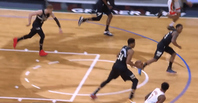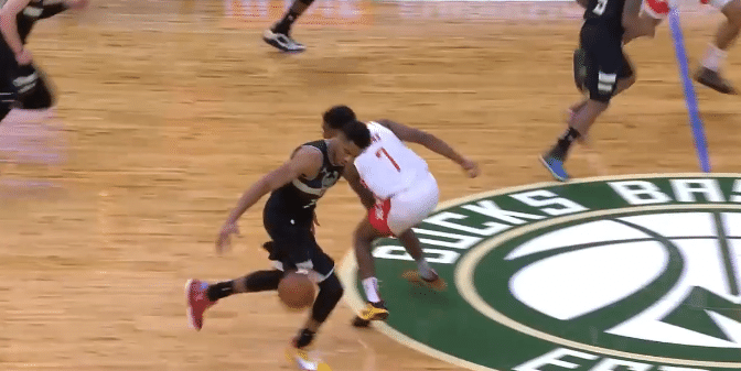这是比赛进行到第二节中段,火箭进攻中传球被字母哥精准抢断,随后字母哥开始持球反击,他先是背后运球过了一个人,然后杀入火箭半场之后虚晃再过一人,突破到篮下之后迎着防守球员,直接对抗上篮打进,抢断反击一条龙,可以用一气呵成来形容。