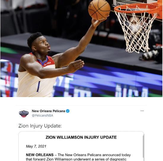 5月8日,在前往费城比赛之前,鹈鹕的超新星“胖虎”锡安接受了CT扫描检查,这个结果让鹈鹕队总经理非常的沮丧。根据检查的结果,锡安遭遇了左手无名指骨折,鹈鹕这边宣布锡安将无限期休赛,此后有运动专家更新报道表示,锡安的伤病如果没有进行手术,需要大概6-7场的缺阵,如果手术将乘以3倍的休息时间。