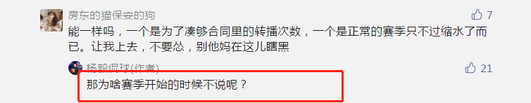 有球迷认为詹姆斯质疑附加赛没问题,上赛季的情况和这赛季不一样。而杨毅的社媒账号回应,“那为什么赛季初的时候不说呢”。这个回复说到了问题所在,詹姆斯如果一早就质疑赛制,不会遭受这么多的批评和质疑。
