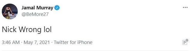 360直播吧讯 北京时间5月7日,福克斯体育评论员尼克-怀特谈到了掘金球星约基奇。他认为约基奇今年大概率会拿下MVP,但是他可能是近35年最菜的MVP。结果,掘金球员贾马尔穆雷立刻在社交媒体上发表自己的观点,他直接评论:尼克-错误。(Nick wrong)