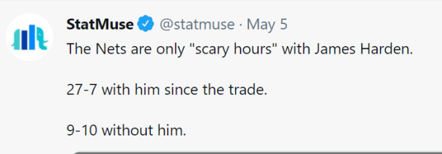今年1月中旬,当哈登交易正式完成时,很多人都认为本就强大的篮网,还要再引进哈登实在奢侈。不过,事实证明,哈登不是篮网的奢侈品,而是必需品。数据显示,自从哈登交易发生后,哈登为篮网出战的比赛,球队27胜7负,胜率高达79.4%,哈登休战的比赛,篮网9胜10负,胜率还不到50%。