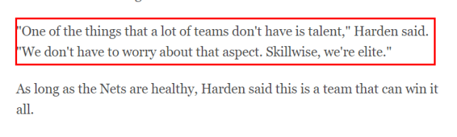 “很多球队都没有的一项优势是天赋,”哈登说,“我们在这一项上无需担忧,从技术层面来说,我们是精英级别的。