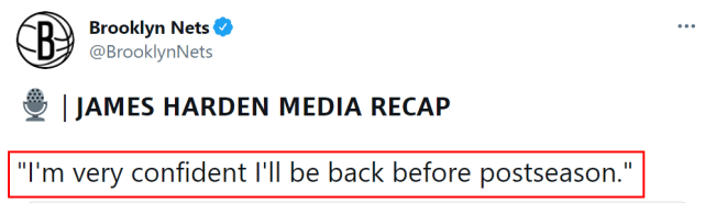 篮网主教练纳什此前曾表示,他不确定哈登是否足够健康能在季后赛首轮前上场。篮网目前排名东部第二,落后费城2个胜场。哈登、杜兰特、欧文本赛季同时出战的比赛只有7场,但哈登表示,自己因伤缺席这么长时间,并没有改变他对篮网冲击总冠军的信心。