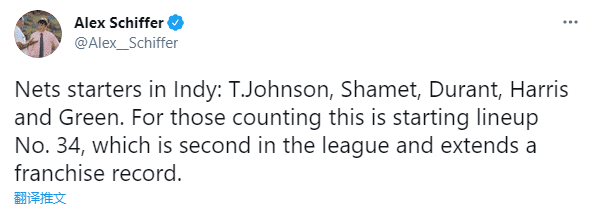 篮网对阵步行者的首发阵容是杜兰特、沙梅特、乔-哈里斯、杰夫-格林和泰勒-约翰逊,这是篮网本赛季第34套首发阵容,63场用了34套首发,如此数据便能看出篮网阵容难以齐整,这是联盟本赛季第二高的首发数,排名第一的是火箭,他们已经用了37套首发阵容。