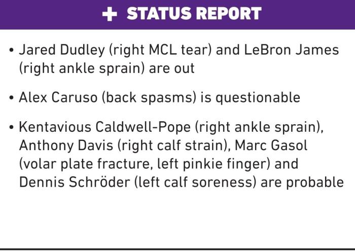 360直播吧讯 北京时间4月30日,洛杉矶湖人公布下一场对阵国王的伤病报告,勒布朗-詹姆斯因脚踝扭伤继续休战,卡鲁索被列为出战成疑,浓眉(小腿拉伤)、波普(脚踝扭伤)、小加索尔(手指骨折)和施罗德(小腿酸痛)都是大概率出战。