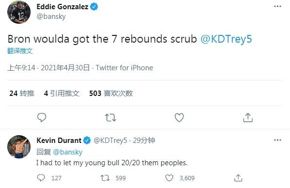 场上炸裂,场下也不能耽误,毕竟场上、场下两开花是杜兰特的目标。赛后,有球迷调侃:杜兰特的这个表现,如果是詹姆斯,一定会多拿7个篮板,显然该球迷有嘲讽詹姆斯刷三双的意思,这个球迷也@了杜兰特。
