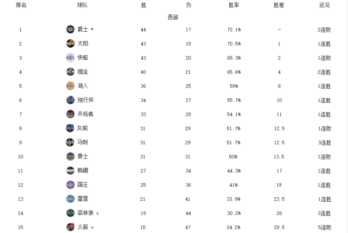 爵士在锁定季后赛席位之后吃到了2连败,他们联盟战绩第一的位置也不稳。太阳上一场获胜之后已经将和榜首之间的差距缩小到1个胜差。快船昨天惨败,他们也浪费了缩小和爵士太阳之间差距的机会。掘金目前拿下2连胜,虽然没有穆雷,但再说MVP大热门约基奇的带领下依旧表现强势。湖人昨天结束3连败,他们继续冲击前四名。独行侠今天火力全开,大胜勇士。开拓者今天终于结束连败,大胜步行者止住颓势。灰熊31胜29负的战绩还是很不错的,有希望拿下附加赛资格。