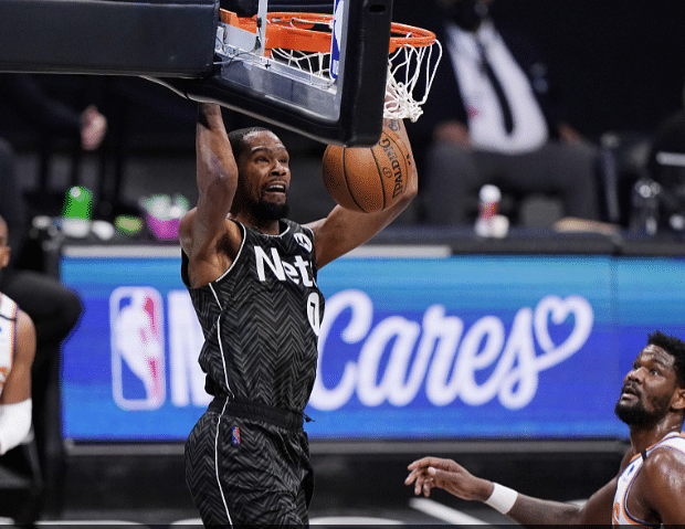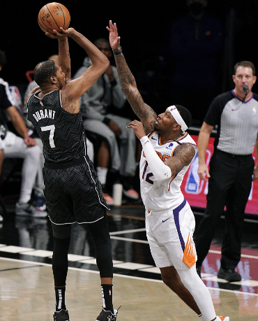 360直播吧讯 杜兰特就是杜兰特,即便是跟腱断裂,复出后接连不断地受伤。状态也不曾受到一丝丝影响。在近日篮网战胜太阳的比赛中,刚刚复出后的杜兰特全场21投12中,三分球3投2中,高效地拿下了33分4篮板6助攻的数据。而从比赛中的杜兰特的进攻图片来看,似乎杜兰特受不受伤,上不上场比赛好像一点都不影响杜兰特的状态。本赛杜兰特打打停停一共只出场了25场比赛。但场均依旧可以得到27.5分6.7篮板5.2助攻的全面数据。他是队内的得分王,是最后关键球的执行官。
