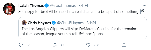 对于考辛斯成功续约快船,目前又失业的小托马斯为考辛斯而高兴,他发推写道:为我的兄弟感到高兴,他需要的只是一个机会去参与某一件事情。