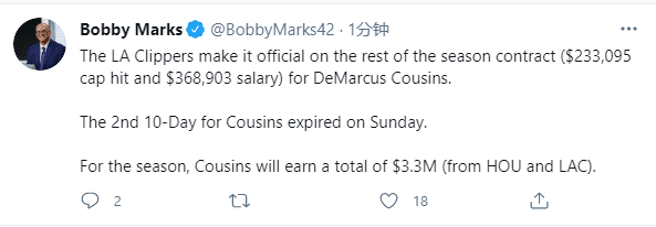 据薪资专家Bobby Marks报道,考辛斯本赛季剩下合同的薪水是368903美元,整个赛季中,考辛斯总共获得330万美元的收入(来自火箭和快船)