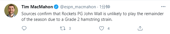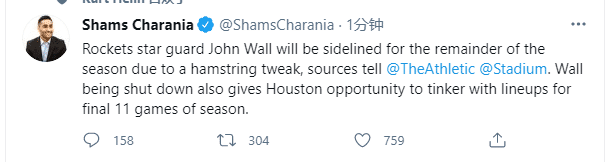 360直播吧讯 北京时间4月27日,火箭核心球星约翰-沃尔提前赛季报销,据名记shams报道,火箭后卫沃尔因腿筋拉伤不会出战剩余的比赛,提前赛季报销;随后火箭记者麦克马洪证实,沃尔遭遇腿筋二级拉伤,本赛季不会再为火箭出战。此前篮网球星哈登也是因腿筋伤病而常规赛报销。