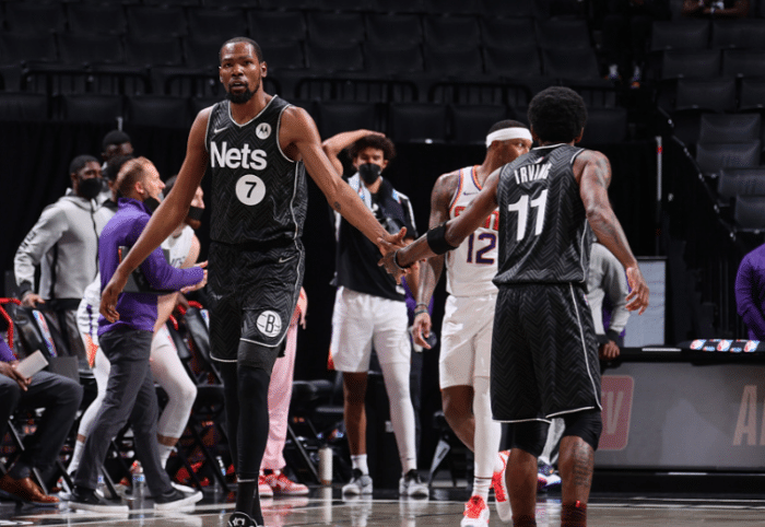 360直播吧讯北京时间4月26日,NBA常规赛结束了一场比赛,篮网主场128-119战胜太阳,目前稳居东部第一。本场比赛欧文和杜兰特均表现出色,欧文全场比赛轰下34分6篮板12助攻,杜兰特替补出战贡献33分6篮板4助攻。