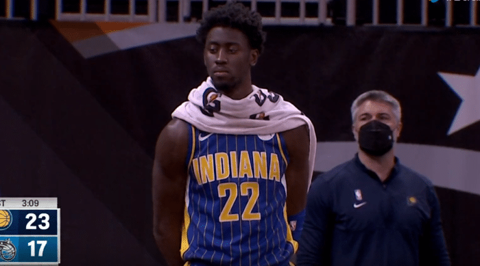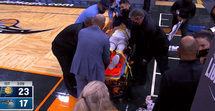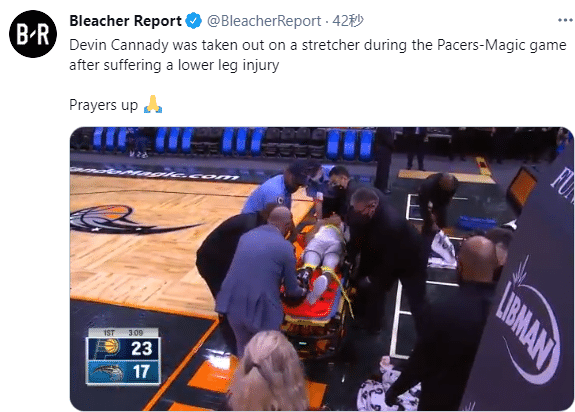 360直播吧讯北京时间4月26日,魔术和步行者比赛中,场上发生意外受伤事件,魔术十天短合同球员德文-坎纳迪惨遭重伤,才上场仅打1分钟却不幸重伤离场,小腿严重受伤,被工作人员用担架抬离现场。