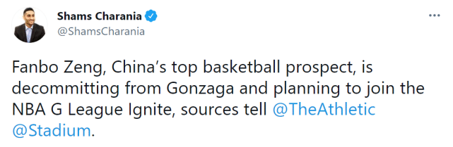 360直播吧讯 北京时间4月25日,据The Athletic名记查拉尼亚报道,中国顶级年轻球员曾凡博将不会前往冈萨加大学,而是计划加入NBA发展联盟(G联赛)的点燃队。