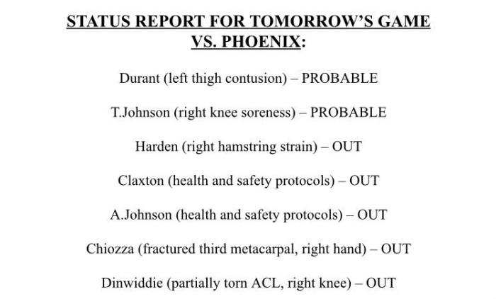 360直播吧讯 布鲁克林篮网正式官宣下一场对阵太阳的伤病报告,哈登(右腿筋拉伤)、齐奥萨(右手骨折)、丁威迪(右膝伤势)以及克拉克斯顿和A-约翰逊五名球员继续缺席比赛,杜兰特(左大腿挫伤)和泰勒-约翰逊(右膝酸痛)出战状态再次升级,都被列为大概率出战。
