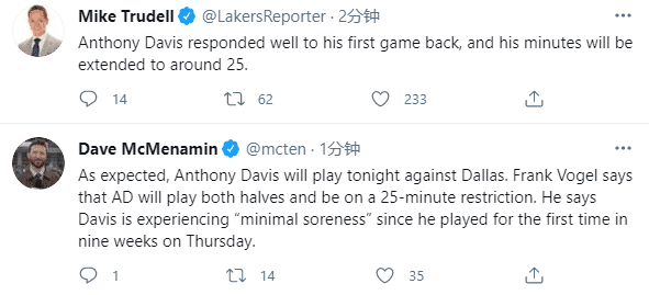 沃格尔表示,浓眉将在今晚继续出战,上下半场都会打,上场时间限制在25分钟;沃帅还透露,自从浓眉时隔9周首次重返赛场后,他仅仅只感到轻微的酸痛。