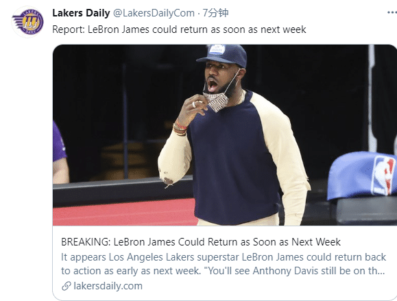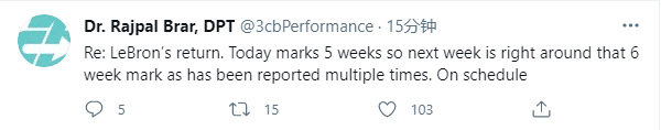 对于詹姆斯最快下周复出的消息,医学专家Dr.Rajpal Brar发推写道:关于詹姆斯的复出,今天刚好是五周,因此下周正好是六周左右,这已经多次被报道,詹姆斯按照时间表而复出。
