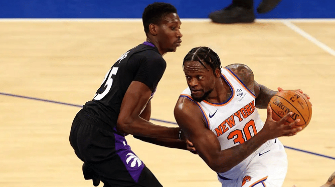 360直播吧讯 今天NBA常规赛继续进行,纽约尼克斯延续他们的出色表现,主场120-103战胜猛龙,稳居东部前四。兰德尔连续两场比赛至少砍下30分10篮板的数据,也是尼克斯最近8年来第一人,上一个做到的是安东尼。同时九连胜也是尼克斯过去25年以来的第二连胜纪录,他们目前的战绩来到34胜27负,55.7%的胜率;再加上球队近期的强势表现,这个赛季最大的黑马堪称纽约尼克斯。