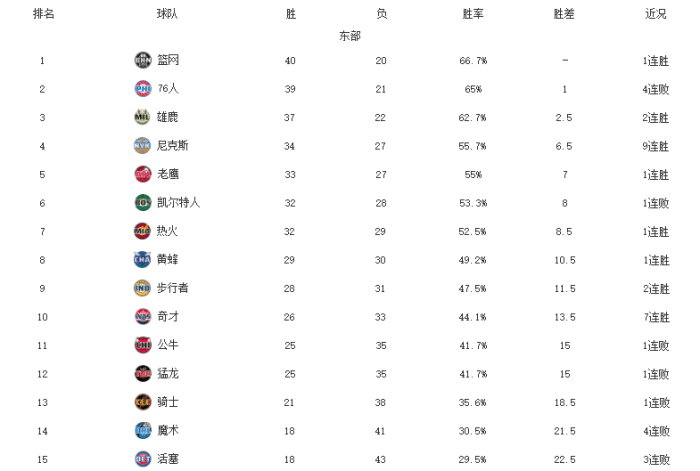 360直播吧讯 NBA常规赛进行到现在,大部分球队都只剩下9-12场比赛了,这其中东部的格局已经越来越清晰了,篮网、费城和雄鹿争夺常规赛东部冠军,尼克斯和老鹰作为黑马搅局直通季后赛的前六名,而附加赛资格的席位也很明朗,猛龙和公牛掉队了,奇才强势逆袭。