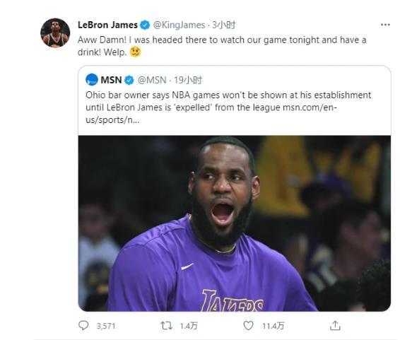 在得知酒吧老板的言论后,詹姆斯本尊也是下场回应,詹姆斯转发了动态并表示:真糟糕,我本想今晚去那里喝一杯,然后看我们的比赛的。詹姆斯的回应也迅速得到了10万球迷的点赞,一万多人转发,不得不说,这个酒吧老板蹭关注成功了,不过显然詹姆斯对于这样的开除令并没有放在心上,毕竟到了詹姆斯如今这个地位,联盟也不敢轻举妄动的。