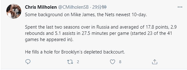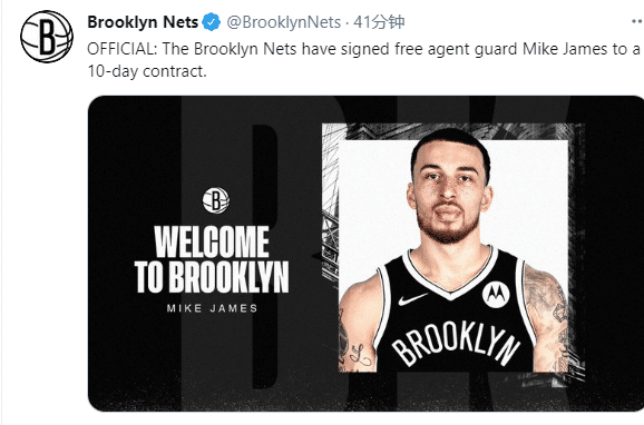 由于篮网伤病满营,又是多达7名球员无法出战,篮网正式官宣签下迈克-詹姆斯,用一份十天短合同签下场均19+5欧洲得分王,迈克-詹姆斯可以出战今天的比赛,有望迎来赛季首秀。