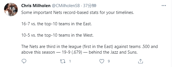 赛季至今,篮网三巨头仅仅只在一起打过7场比赛,但篮网打强队的战绩不错——篮网对阵东部前十球队的战绩是16胜7负,对阵西部前十球队的战绩是10胜5负,对阵胜率至少50%球队的战绩是19胜9负排在东部第一以及联盟第三,仅仅落后爵士和太阳。